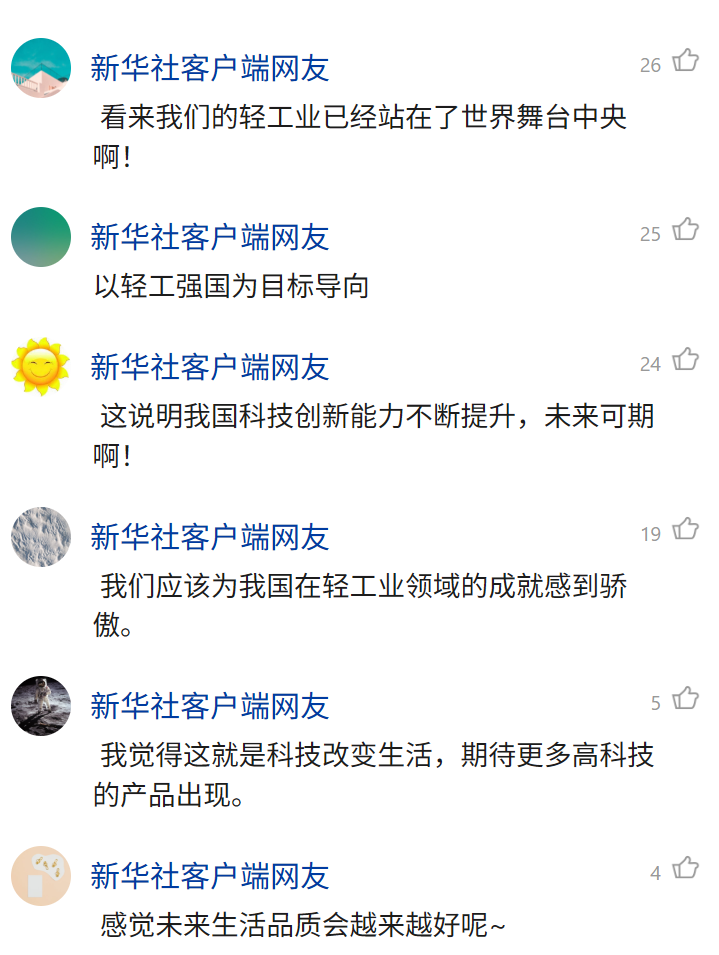 报道发出后,文章线上浏览量突破150万次,广大网友热烈评论“看来我们的轻工业已经站在了世界舞台中央啊!”。轻工业的高质量发展,为国民经济稳健发展和人民美好生活需要提供坚实支撑。(以下为部分评论内容)