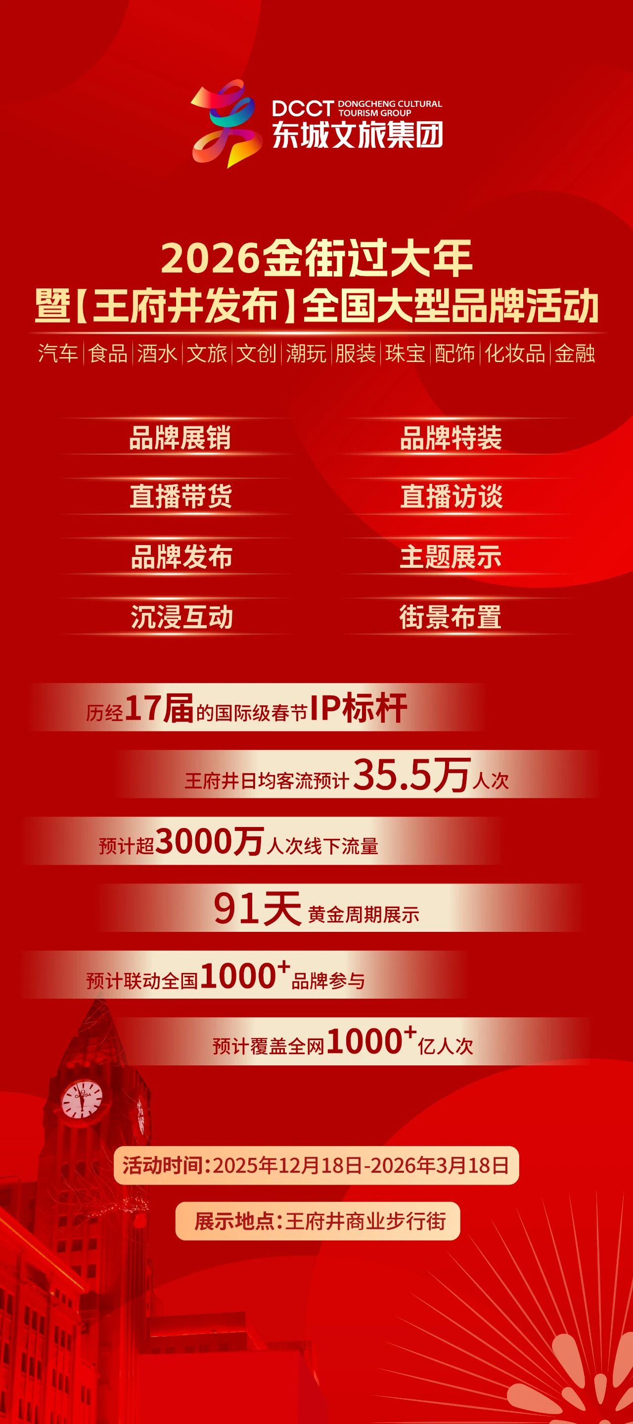 在国家"十五五"品牌升级与消费提振的双重机遇下, “2026金街过大年暨【王府井发布】全国大型品牌活动”,拟于2025年12月18日-2026年3月18日举办,由北京东城文旅发展集团有限公司主办,北京睿智动力文化传播有限公司承办,中国财富传媒集团、 、中国服装协会、中国百货商业协会、中国食品药品企业质量安全促进会、抖音、东方甄选等多家单位支持,以“万马奔腾 福满金街”为主题,横跨包含元旦、春节、元宵等多个节日的13个黄金消费周,预计将吸引超3000万线下客流,聚集文创、潮玩、汽车、酒水、食品、电器、服装、服饰、珠宝、化妆品、全国优秀文旅等领域优秀品牌及创新品牌代表。