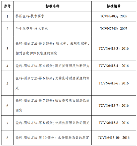 越南建筑卫生陶瓷产品标准是由科技部下属的标准与质量局制定。该部门负责全国标准、计量、认证认可、质量管理等,也是越南WTO/TBT国家咨询点。其他与TBT工作相关的部门还有建设部、自然资源与环境部、交通部、信息与通信部。