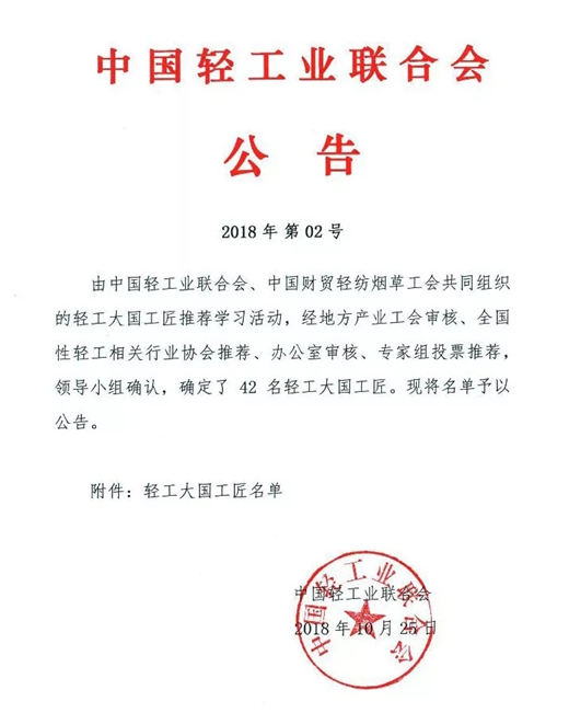 10月25日, 发布了轻工“大国工匠”名单, 共有42名优秀匠人入选“大国工匠”。其中,提琴制作大师、中国乐器协会提琴制作师分会会长郑荃榜上有名。