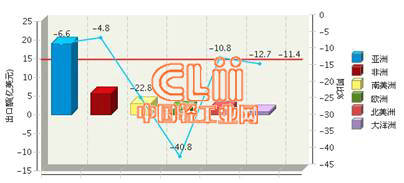 图2 2014年1~6月我国陶瓷砖累计出口额各大洲同比情况