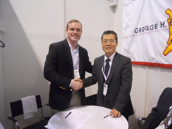 中国皮革协会理事长苏超英和美国原料皮协会主席Stephen Sothmann在互换备忘录上签字。