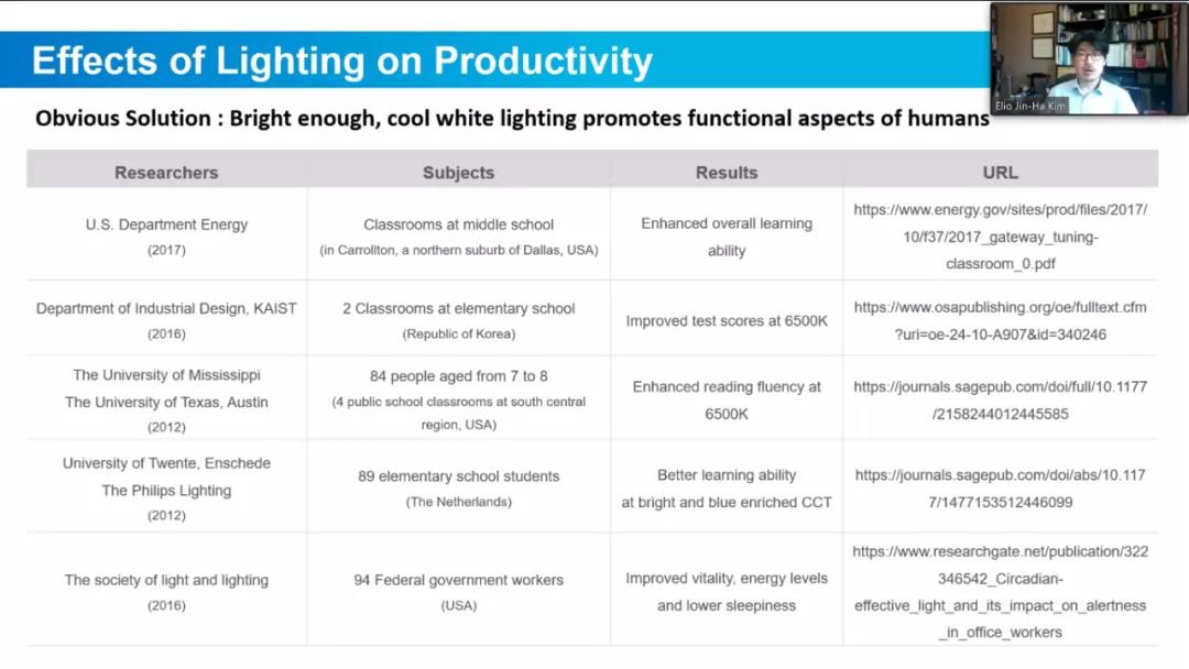 杨彪副教授在《Human Factors in Urban Lighting: Evidence-based Research for Better Lit Environment》报告中,讨论了照明中的人因问题及其框架,通过精心设计的实验获得经验证据,并以循证实践为“低头者”、老年人和那些无法获得充足自然光的人群提供更好的照明环境。Kodai Kawagishi带来的《Study on development of static transparent daylighting louver using non-imaging optics and performance evaluation》报告,考虑通过允许一定程度的眩光而设计出一种用于窗户照明的透明百叶窗,在不影响舒适性的情况下获得令人满意的光环境,并利用光学分析的方法对DGP的室内照明环境和来自该百叶的眩光进行了评价,同时也考虑了照明设备对光环境的影响。Elio Jin-Ha Kim工程师在《Lighting that completes healthy and efficient learning environments for students》报告中,提出了两种光谱调谐LED,其中一种具有青色增强光谱,另一种具有青色减弱光谱。通过一系列临床试验,将这些新型LED与传统的白色LED进行对比测试,结果提高了白天和夜间较早的 DLMO(暗光褪黑激素发作)的浓度水平。孔光艳博士带来的《Research on the Optimization of Lighting Quality in Reading Space》报告,根据不同阅读模式的特点,从光源选择、照明质量、背景环境、阅读媒体四个层面研究了影响阅读舒适性的关键因素和影响规律;建立了人类行为模式、阅读环境、光源参数与照明节能的关系;并针对阅读舒适度和节能性提出了优化建议。