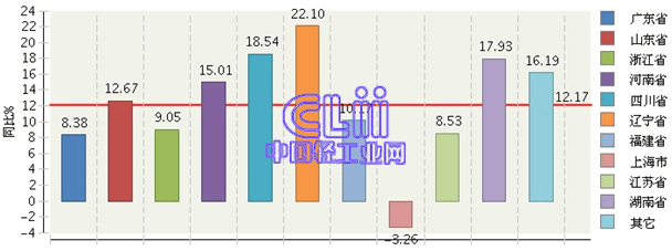 1~7月,家具行业累积主营业务收入居全国前10位的地区中,只有河南超过四川列第四位,其他8个地区的排名不变;广东、山东和浙江依旧稳居前三位,其中,广东的累计主营业务收入(下同)占20.22%;山东占13.26%;浙江占10.97%(图6)。