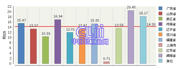 图7 2013年主要地区家具行业规模以上企业累计主营业务收入增速情况
