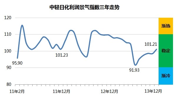 中轻日化景气指数三年来波动幅度较大,自2013年从“稳定”区间高位开局以来,逐月走低,7月跌至三年最低值91.93,之后触底反弹,逐月回升,12月该指数回升至101.21点,全年成先抑后扬的“V”型走势(见图1-12)。