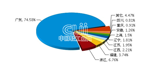 2013年,全国照明行业对马来西亚累计出口额11.45亿美元,在所有贸易国中位居第六。从出口地区来看,比重主要集中在广东、浙江、福建、江西、江苏等地区。其中:广东完成累计出口额8.54亿美元,占全部出口额的74.58%,增速达86.88%。