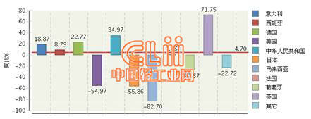 2013年1~12月全国陶瓷砖行业累计进口额主要贸易国同比增长情况