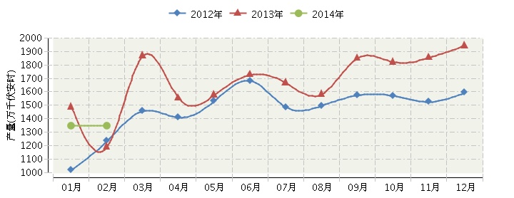 根据国家统计局公布数据,2014年1月~2月,全国铅酸蓄电池行业累计完成产量2,697.13万千伏安时,同比增长10.17%。2014年全国太阳能电池行业连续三年月度产量对比如下图所示。