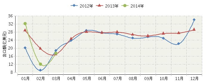 2014年全国皮革及其制品行业连续三年月度出口额对比