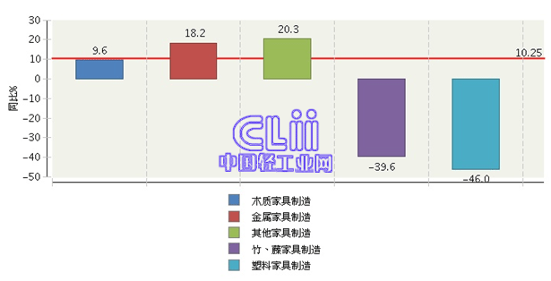 同期,金属家具制造业和其他家具制造业的累计利润总额增速(下称“累计增速”)保持了快速增长,且超过了家具行业平均水平;竹、藤家具制造业、塑料家具制造业的累计增速则是大幅下滑,分别降至-39.60%和-46.02%(图5),比2013年同期下降了217.26个百分点和104.37个百分点。