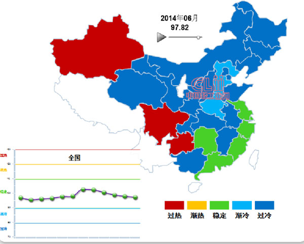 2014年6月,处于“稳定”区间的地区有5个,分别是:湖南、福建、广东、江苏和浙江,占全国的16.13%。处于“浙冷”区间的地区有2个,分别是:河南、河北。处于“过热”区间的地区有3个,分别是:新疆、云南和贵族。其它地区均处于过冷状态(不含西藏、云南、宁夏、海南)(图3)。