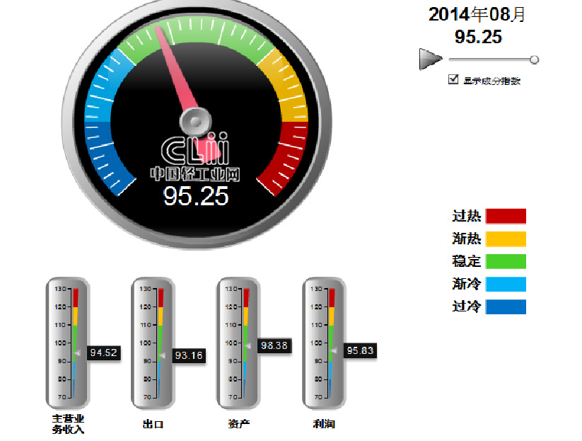 发布2014年8月中轻照明景气指数。8月,中轻照明景气指数95.25,其中:主营业务收入景气指数为94.52,出口景气指数为93.16,资产景气指数为98.38,利润景气指数为95.83(图1)。