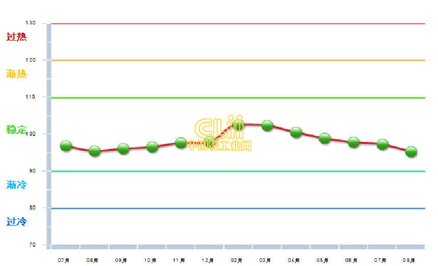 2014年8月中轻照明景气指数连续13个月在稳定区间运行,8月景气指数为2014年各月最低值,且低于去年同期值(图2)。