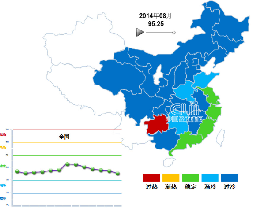 2014年8月,处于“稳定”区间的地区有4个,分别是:安徽、福建、广东、浙江,占全国的12.90%。处于“过热”区间的地区有1个:贵州,分别是:四川和贵州。处于“渐冷”区间的地区有3个,分别是:湖南、河南、山东。其它地区均处于过冷状态(不含西藏、新疆、云南、宁夏、海南)(图3)。