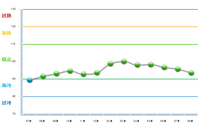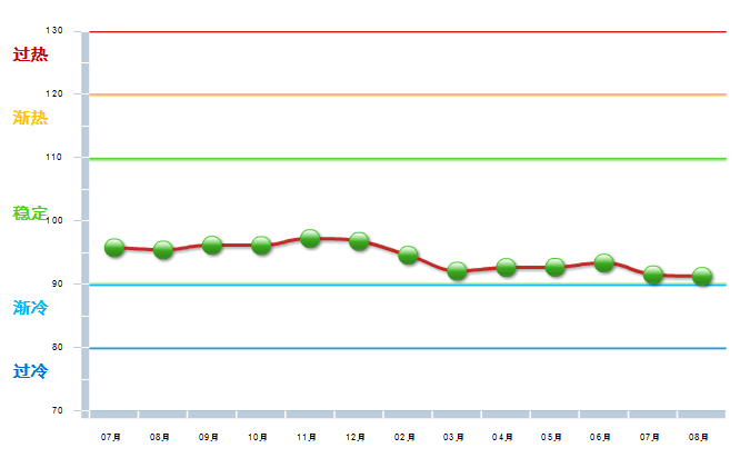 2013年7月至2014年8月中轻工艺美术景气指数处于基本稳定状态。与2013年7月同期比较有所下降,2014年8月份中轻工艺美术景气指数与2014年7月份相比基本持平。(参见图2)