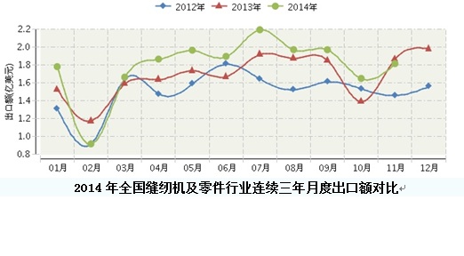 2014年1~11月,全国缝纫机及零件行业累计完成出口额19.66亿美元,同比增长8.01%。月度出口增速除2月、11月两个月为负外,其余月份均为正。出口较平稳。
