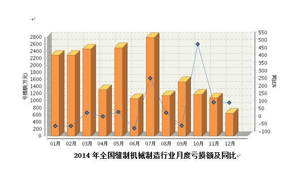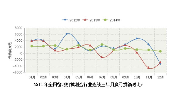 2014年1~12月,全国缝制机械制造行业累计完成亏损额20,233.60万元,同比增长221.29%。其中:1月份完成亏损额2281.7万元,同比增长-35.73%;2月份完成亏损额2281.7万元,同比增长-35.73%;3月份完成亏损额2457.7万元,同比增长53.74%;4月份完成亏损额1306.7万元,同比增长29.58%;5月份完成亏损额2499万元,同比增长57.57%;6月份完成亏损额1053.9万元,同比增长-50.37%;7月份完成亏损额2785万元,同比增长279.84%;8月份完成亏损额1136.9万元,同比增长52.34%;9月份完成亏损额1532.9万元,同比增长-31.79%;10月份完成亏损额1177万元,同比增长502.39%;11月份完成亏损额1079.1万元,同比增长121.71%;12月份完成亏损额642万元,同比增长119.45%。
