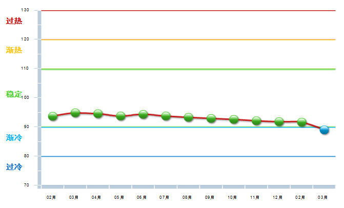 2014年2月至2015年2月,中轻皮革景气指数基本稳定,在90~100间小幅波动,处于稳定提示区的下半区运行。3月中轻皮革景气指数89首次跌入渐冷提示区,预示皮革行业将面临困境(参见图3)。