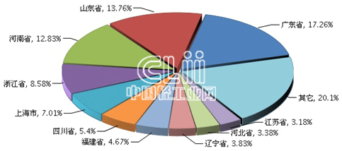 1~11月,家具行业累计利润额居全国前十地区的排名与1~10月相同,依次是广东、山东、河南、浙江、上海、四川、福建、辽宁、河北及江苏。其中,广东累计实现利润总额(下同)占17.26%,山东占13.76%,河南占12.83%,浙江占8.58%,上海占7.01%,四川占5.40%,福建占4.67%,辽宁占3.83%,河北占3.38%,江苏占3.18%(图6)。