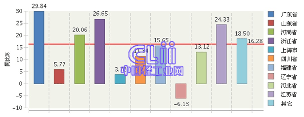 图7 2014年1~11月主要地区家具行业规模以上企业累计利润总额增速情况
