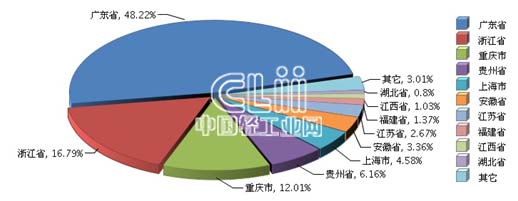 2015年1~3月,全国灯具及照明装置行业完成累计产量7.97亿套,同比增长12.09%。比重主要集中在广东、浙江、重庆、贵州、上海等地区。其中:广东累计产量3.84亿套,占全国总产量的48.22%,同比增长20.2%。