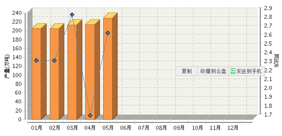 根据国家统计局公布数据,2015年1月~5月,全国乳制品行业累计完成产量1,065.20万吨,同比增长1.75%。其中:1月份完成产量204.71万吨,同比增长2.37%;2月份完成产量204.71万吨,同比增长2.37%;3月份完成产量213.33万吨,同比增长2.88%;4月份完成产量213.74万吨,同比增长1.74%;5月份完成产量228.53万吨,同比增长2.68%。2015年月度数据走势及同比增长情况如下图所示。
