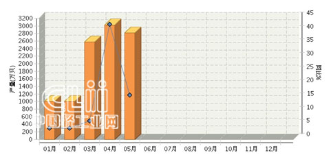 2015年1月~5月,江西荧光灯行业累计完成产量11,626.50万只,同比增长32.49%。其中:1月份完成产量1001.45万只,同比增长4.15%;2月份完成产量1001.45万只,同比增长4.14%;3月份完成产量2571万只,同比增长6.96%;4月份完成产量3021.6万只,同比增长42.71%;5月份完成产量2809.2万只,同比增长16.54%。