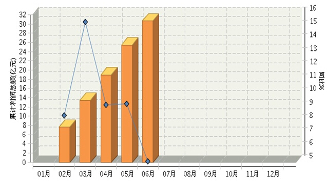 图1 2014.5—2015.6自行车行业利润景气指数变化态势 2015年1月~6月,全国自行车制造行业累计完成利润总额30.64亿元,同比增长5.08%,增速比5月份放缓4个百分点,为上半年最低水平。(参见图2)。 图2 自行车行业月度累计利润总额走势图 从子行业分布情况看,电动自行车行业累计利润总额超过17亿元,同比下降7.34%;脚踏自行车行业累计利润总额超过13亿元,同比增长28.4%。