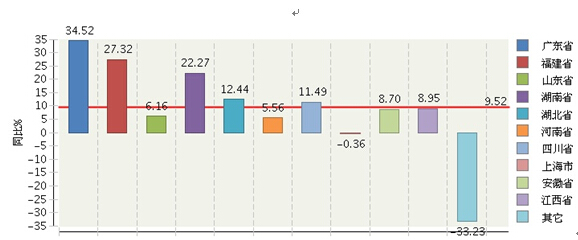 图 2015年1月~7月全国糖果累计产量主要地区同比增长情况