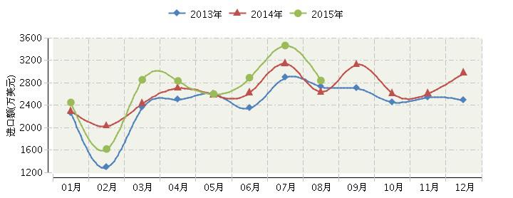 - 2015年1-8月乐器行业进口额月度走势2015/9/22 13:34:37