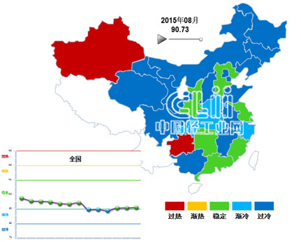 2015年8月,处于“稳定”区间的地区有6个,分别是陕西、河北、安徽、湖南、广东和福建。比上个月多两个。处于“过热”区间的地区有2个:贵州和新疆,占全国的6.45%。处于“渐冷”区间的地区有4个,分别是:河南、湖北、重庆和浙江。其它地区均处于过冷状态(不含西藏、云南、宁夏、海南),过冷地区范围。