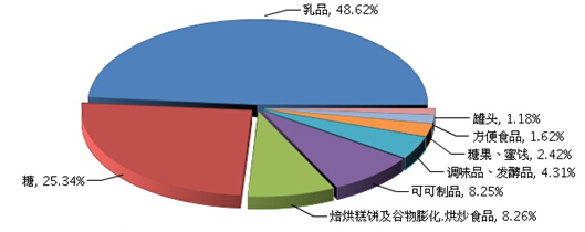 乳品是食品行业的主要进口商品,2015年1~7月乳品进口比重占食品行业进口总额的48.62%;其次是糖占25.34%;焙烘糕饼及谷物膨化.烘炒食品占8.26%;可可制品占8.25%;调味品、发酵品占4.31%;糖果、蜜饯占2.42%;方便食品占1.62%;罐头占1.18%。
