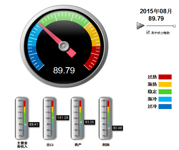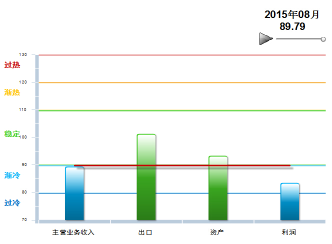 和中国皮革工业协会联合发布2015年8月中轻皮革景气指数。8月份中轻皮革景气指数89.79,较7月的89.65上升0.14个百分点。其中:主营业务收入景气指数为89.41,出口景气指数为101.28,资产景气指数为93.35,利润景气指数为83.48(参见图1、2)。