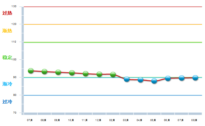 2014年7月至2015年2月,中轻皮革景气指数基本稳定,在90~100间小幅波动,处于稳定提示区的下半区。3月中轻皮革景气指数89首次跌入渐冷提示区, 6、7、8月虽然运行在渐冷提示区,但已逐步呈现企稳回升态势(参见图3)。