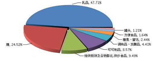 乳品是食品行业的主要进口商品,其进口比重占食品行业进口总额的47.71%;其次是糖占24.52%;焙烘糕饼及谷物膨化.烘炒食品占9.49%;可可制品占8.57%;调味品、发酵品占4.41%;糖果、蜜饯占2.44%;方便食品占1.64%;罐头占1.21%。