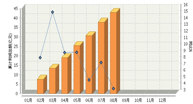 和中国自行车协会联合发布中轻自行车行业景气指数,2015年8月,自行车行业利润景气指数86.77,比2015年7月份下降3.23。 2014年,自行车行业利润景气指数平稳增长,12月有较大幅度下降。进入2015年后,受两节因素以及国内外大环境影响,利润指数持续走低,尤其是二季度以来,一直处于下降走势,8月份继6月份后再度步入渐冷区间。(见图1)。 图1 2014.8—2015.8自行车行业利润景气指数变化态势 2015年1月~8月,全国自行车制造行业累计完成利润总额42.97亿元,同比增长3.77%。,增速比7月份下降4个百分点。(参见图2)。 图2 自行车行业月度累计利润总额走势图 从子行业分布情况看,电动自行车行业累计利润总额超过26亿元,同比下降2.42%;脚踏自行车行业累计利润总额超过16亿元,同比增长15.7%。