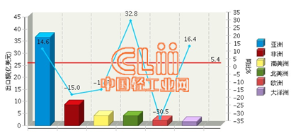 图2 2015年1~9月我国陶瓷砖累计出口额各大洲同比情况