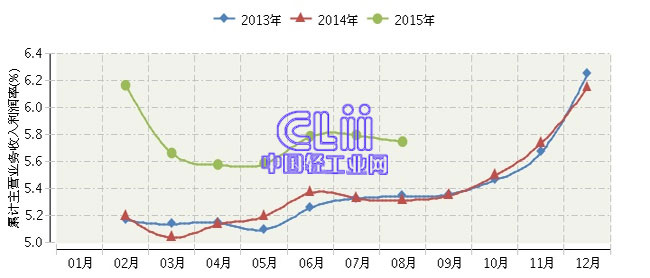 2015年1~8月全国家具行业累计主营业务收入利润率为5.75%