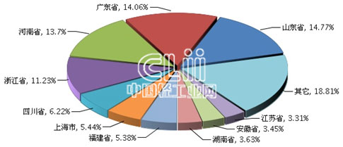 1~4月,家具行业累计利润额居全国前十的地区位次与1~3月相比发生一些变化,山东和广东一起超越河南居前两位,福建越过上海成为第六,其他6个地区的名次不变。其中,山东累计利润总额(下同)占14.77%,广东占14.06%,河南占13.70%,浙江占11.23%,四川占6.22%,上海占5.44%,福建占5.38%,湖南占3.63%,安徽占3.45%,江苏占3.31%(图6)。