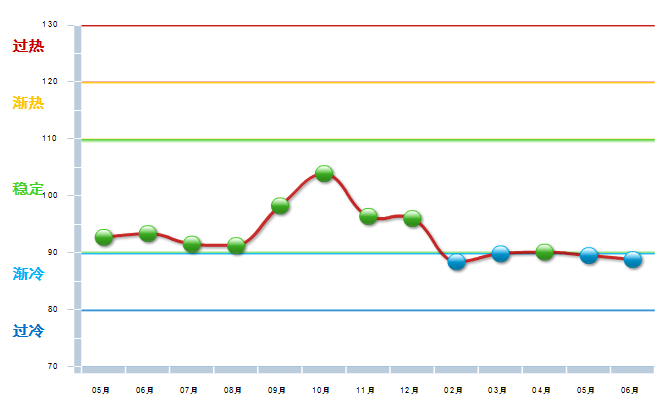工艺美术利润景气指数一年来尽管在稳定区域运行,但处于下降趋势,至6月已降至渐冷区域运行。