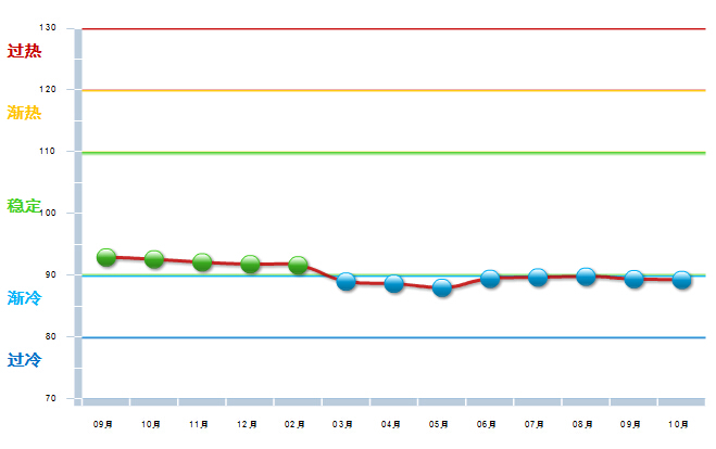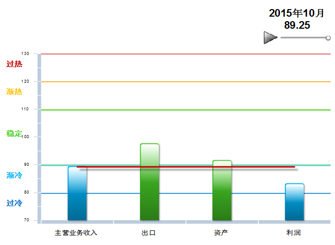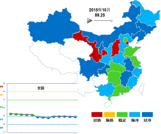 2014年9月至2015年2月,中轻皮革景气指数基本稳定,在90~100间小幅波动,处于稳定提示区的下半区。3月中轻皮革景气指数89首次跌入渐冷提示区,10月仍然在渐冷提示区运行(参见图3)。