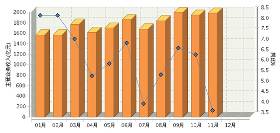 2015年1月~11月,全国食品行业累计完成主营业务收入19,510.78亿元,同比增长6.23%。主营业务收入总体呈环比上升的走势,其中:11月份完成主营业务收入1983.88亿元,同比增长3.82%。