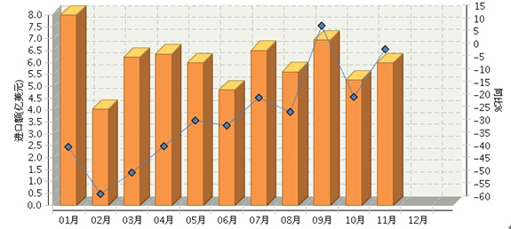2015年1~11月,全国食品行业累计完成进口额65.77亿美元,同比增长-28.74%。进口额波动较大,下降幅度逐月收窄。其中:11月份完成进口额5.99亿美元,同比增长1.51%。