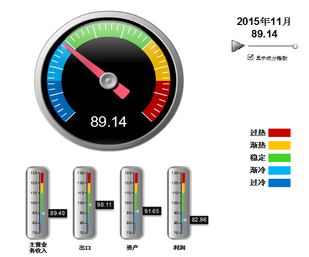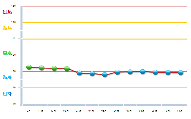 2014年10月至2015年2月,中轻皮革景气指数基本稳定,在90~100间小幅波动,处于稳定提示区的下半区。3月中轻皮革景气指数89首次跌入渐冷提示区,至12月已经在渐冷提示区运行10个月(参见图3)。