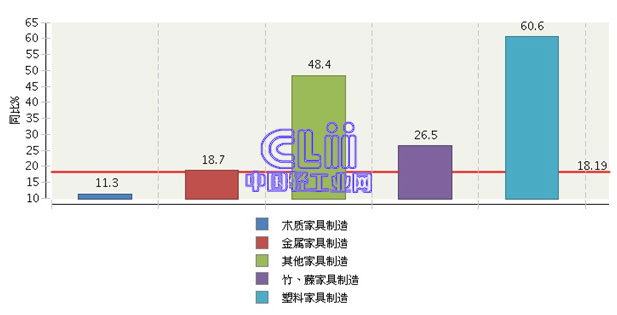 同期,塑料家具制造业、其他家具制造业的累计利润总额增速(下称“累计增速”)持续高速发展,分别比家具行业平均水平高了42.39个百分点和30.20个百分点;竹、藤家具制造业的累计增速也呈现快速增长,达到了26%以上;虽然金属家具制造业与木制家具制造业的累计增速相对较低,但是也都显示为两位数增长,其中前者略高于行业家具行业平均水平(图5)。