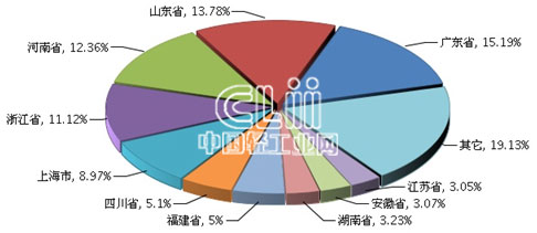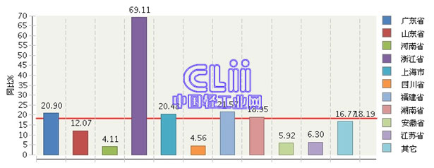 1~7月,家具行业累计利润额居全国前十位地区中,除安徽和江苏超过成为第九、第十以外,前八位地区的位次与1~6月相同。其中,广东累计利润总额(下同)占15.19%,山东占13.78%,河南占12.36,浙江占11.12%,上海占8.97%,四川占5.10%,福建占5.00%,湖南占3.23%,安徽占3.07%,江苏占3.05%(图6)。