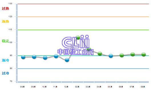 2015年8月,家具行业利润景气指数依旧在“稳定”区间的下限附近运行,但环比7月下降了0.10个百分点(图1)。
