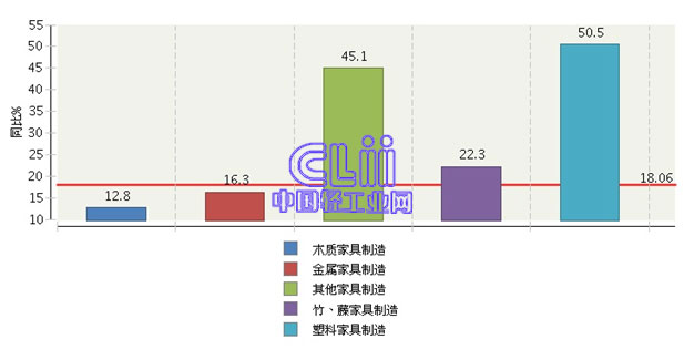 同期,塑料家具制造业的累计利润总额增速(下称“累计增速”)最快,高达50.50%;其次是其他家具制造业,累计增速达到45.07%;竹、藤家具制造业居第三位,累计增速为22.29%;尽管木制家具制造业、金属家具制造业的累计增速都低于家具行业平均线,但仍保持了12%以上的增长(图5)。