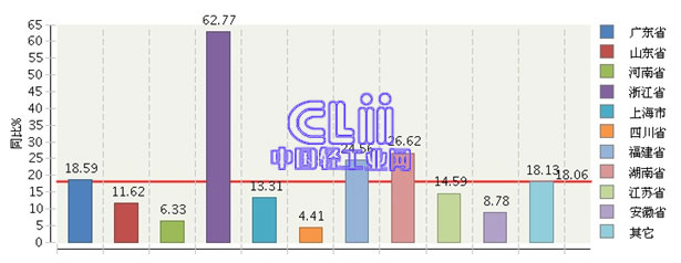 同期,上述10个地区中,浙江的累计利润总额增速(下称“累计增速”)最快,高达62.77%;湖南和福建的累计增速超过了24%;广东的累计增速略高于全国家具行业平均速度;其他6个地区的累计增速均低于平均线,其中,江苏、上海及浙江的累计增速在11%以上,河南和四川仅显示为个位数增长(图7)。